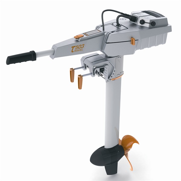 Torqeedo outboard with integrated 320Wh lithium battery, 1.5HP equivalent, including GPS based range calculation, integrated information display and charger. Long shaft version.